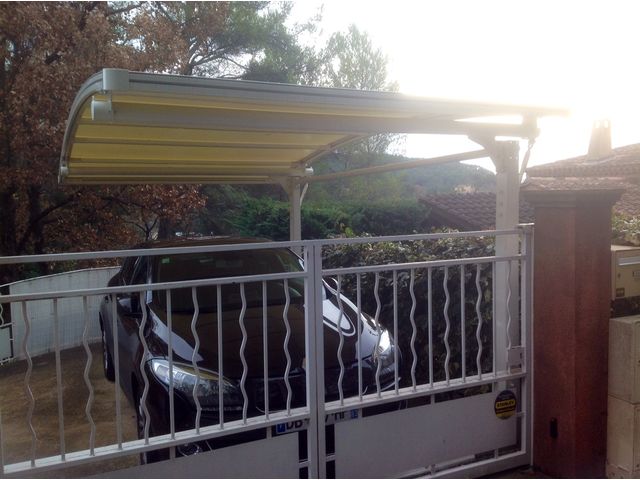 Dimensions : Largeur 3.00 m, Longueur 5.00 m, Hauteur 1.80 m à 2.20 m (réglable)Matériaux : Structure en acier 160 x 80 x 5, Toit en aluminium profilé 80 mm x 50 mmCouverture : Polyester tramée fibre de verre, traité anti UV, PVC double facePoids : 130 kgRésistance au vent : Testé en soufflerie CSTB à des vents allant jusqu'à 150 km/hFixation au sol : Nécessaire pour des vents supérieurs à 80 km/hGarantie : 10 ansAdaptabilité : Réglable en hauteur et adaptable à tous les types de terrains, y compris dénivelés