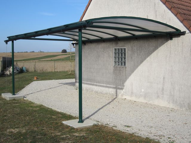 Structure: Acier thermolaquéCouleurs: Large choix de coloris disponiblesToiture: Polycarbonate alvéolaire traité anti-UV (épaisseur 10 mm)Dimensions utiles: L 3.34m x l 5.00m x H 2.00mDimensions hors tout: L 3.34m x l 5.34m x H 2.30mFixation: Scellement sur platines et supports murauxÉquipements: Gouttières et descente de gouttièreFournisseur: ALTO PRODUCTION
