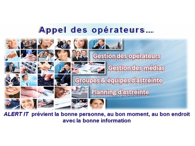 “ - ALERT IT s’interface très facilement avec la plupart des systèmes informatiques (Logiciels, Matériels, Environnement. - Sur activation d’une alarme, ALERT IT déclenche l’exécution d’une liste d’actions associées. Des actions peuvent aussi être déclenchées lors du retour à l’état normal ou l’acquittement d’une alarme. - ALERT IT transmet l’information en utilisant tous les médias proposés par la technologie moderne. - ALERT IT intègre des fonctionnalités de gestion d’astreinte très évoluées, permettant de définir de façon simple et très intuitive les personnes à prévenir pour chaque type d’alarme, y-compris les actions à effectuer en cas d’échec. - Acquittement des appels - Contrôle de l’aboutissement des appels - Acquittement des alarmes - Le module ALERT IT WEB permet d'exploité ALERT IT via un Intranet ou Internet à partir d’un simple navigateur WEB. - La table des alarmes affiche l’état courant des alarmes présentes sur l’installation (alarmes actives ou non acquittées), avec toutes les informations associées (horodatage, acquittement, …). - L’ensemble des données supervisées sont présentées sous la forme d’une structure arborescente de serveurs de données et de groupes permettant de localiser et identifier les systèmes ou les sous ensembles fonctionnels en alarme. ”
