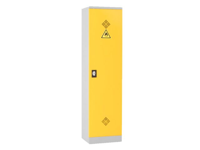 Armoire de sécurité 1 porte pour produits dangereux pour le stockage simple et efficaceCette armoire monobloc en acier permet le stockage sécurisé de produits acides et corrosifs, ainsi que de petites quantités de produits inflammables. Elle offre une solution pratique pour organiser et sécuriser vos substances chimiques au quotidien.Conçue pour résister aux usages intensifs, cette armoire présente : Structure acier monobloc robuste Peinture poudre époxy résistante aux environnements chimiques Fermeture 2 points à clé, poignée aluminium encastrée Porte avec ouverture à 215° pour un accès large et pratique Aérations haute et basse sur la porte Coloris jaune RAL 1021, pour une identification immédiate du stockage dangereuxCette construction permet une utilisation fiable dans les ateliers, laboratoires ou zones techniques.L’armoire est équipée de : 4 tablettes de rétention de 6,75 L ou 13 L (sans caillebotis) Réglage fin au pas de 4,6 cm pour s’adapter à tous vos contenants Charge maximale par tablette : 40 kg Charge totale : 160 kg Capacités de rétention proposées : 32 litres avec 4 bacs ou alors 18 littres avec 4 bacsLa rétention limite les risques liés aux fuites ou renversements accidentels, améliorant la sécurité du poste de travailÀ qui s'adresse cette armoire ? Laboratoires professionnels Industries chimiques ou pharmaceutiques Services techniques et maintenance Ateliers manipulant acides, bases, solvants et produits corrosifs Établissements nécessitant un stockage sécurisé en faible volumeSon format compact en fait une solution idéale pour les zones étroites ou les postes de travail nécessitant un accès direct aux produits chimiques.À noter : cette armoire est idéale lorsque l’objectif est de stocker des produits dangereux à proximité, mais elle n’est pas adaptée si des obligations réglementaires strictes (normes de sécurité incendie ou chimique) doivent être respectées, car elle ne répond à aucune norme en vigueur.