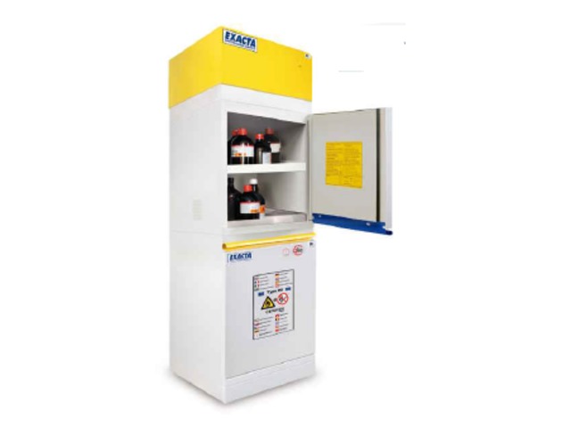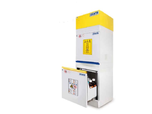 Le compartiment acides/bases dispose de panneaux de finition interne en mélaminé avec haute résistance aux vapeurs chimiques et agressives, d’une ouverture de la porte avec un angle de plus de 110°, d’une fermeture à clé et d’étagères de rétention en acier peint et inox ajustables en hauteur.