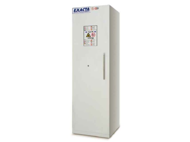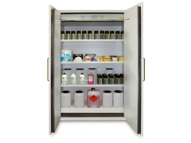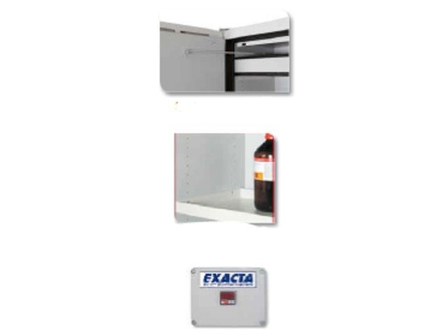 Conforme aux normes EN14470-1 Type 90 et EN14727, cette armoire, de couleur Gris RAL7035, dispose d’une finition extérieure en résine époxy anti-acides, de panneaux de laine de roche haute densité et des panneaux de sulfate de calcium pour l’isolation, de panneaux de finition interne en mélaminé avec haute résistance aux vapeurs chimiques et agressives, de 3 étagères en acier peint ou en acier inox (en option) ajustables en hauteur et d’un bac de rétention avec caillebotis.