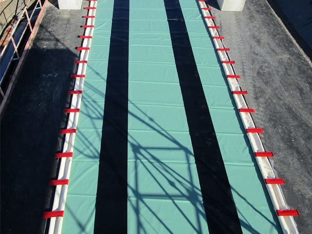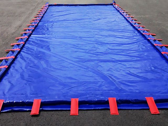 constitué de flotteurs en mousse PE et de plaques de maintien soudées au bac qui remontent au fur et à mesure du remplissage. Les bords en mousse se reforment après le passage des véhicules