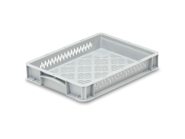Bac norme Europe de 400 x 300 mm en copolymère de polypropylène, entièrement recyclable. De qualité alimentaire, ce bac peut s'utiliser dans l'industrie agro-alimentaire. Avec son cadre et ses angles renforcés, il peut également s'utiliser dans la logistique, la manutention, le transport automatisé... Les surfaces sont lisses pour permettre un nettoyage facile. Le fond du bac est ajouré et les parois sont soit entièrement ajourées (pour les grands modèles), soit ajourées et pleines (pour les plus petits modèles). Les modèles avec des parois ajourées et pleines possèdent les deux côtés pleins ou ajourés en face l'un de l'autre. Plusieurs hauteurs sont disponibles : 70 à 320 mm, pour un volume de 5,4 à 29 litres, selon modèle. Il est gerbable et peut supporter une charge statique jusqu'à 20 kg. Ce bac Euronorm est de coloris gris RAL 7040 et possède des poignées fermées ou ouvertes. La température d'utilisation du bac est de -20°C à +40°C en cycle long, et jusqu'à +80°C en cycle court (pour du lavage par exemple). Trois autres types de fond disponibles sur demande : fond plein, fond plein avec trous de drainage, fond plein nervuré et renforcé. Couleurs personnalisées sur demande moyennant un supplément.Pour plus d'informations vous pouvez également consulter notre guide d'achat : Comment choisir son bac de stockage plastique? ou demander à notre équipe commerciale.