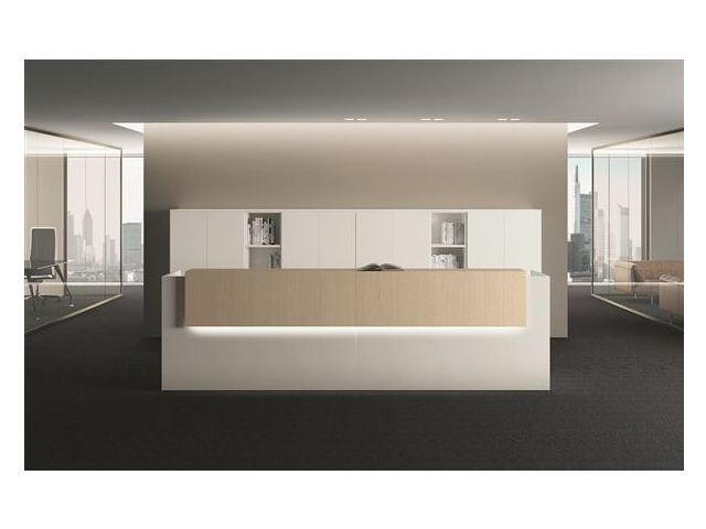 Les plans de travail disposent d'une poutre de support horizontale en acier verni en époxy. Les étagères, quant à elles, sont équipées de supports métalliques et sont pré-disposées pour l'éclairage LED en option. En ce qui concerne les panneaux, ils sont fournis avec des patins de réglage et de plaques en plastique afin de garantir la bonne pose de la banque d’accueil.