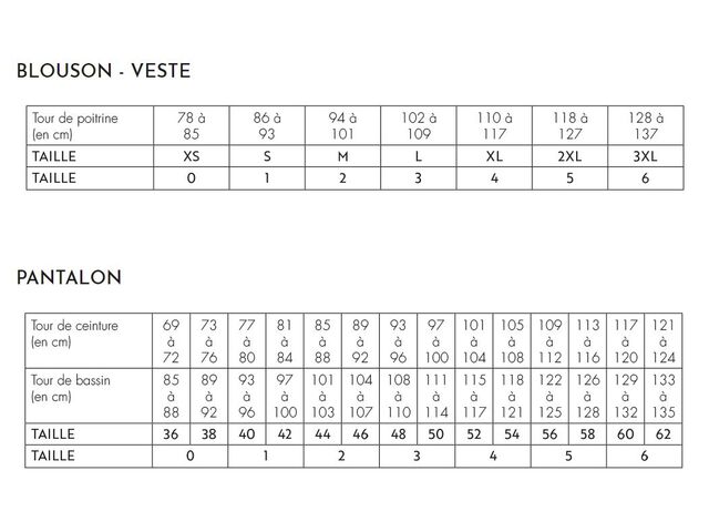 Le blouson et le pantalon peuvent être achetés séparément sur demande.