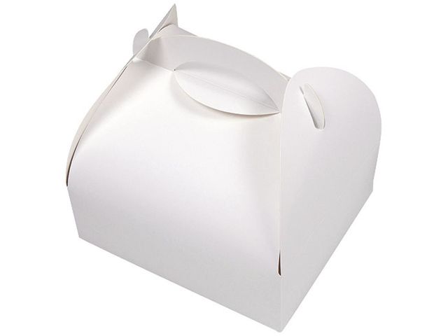 Boites patissières avec poignée blanches en carton, 10,5x10x5 cm.Cette boîte patissière dispose d'une forme plus attrayante que la boîte pâtissière traditionnelle indispensable des pâtissiers pour protéger leurs gâteaux, mignardises, tartes ou petits fours.Résistante et personnalisable, cette boîte dispose d'une poignée intégrée.