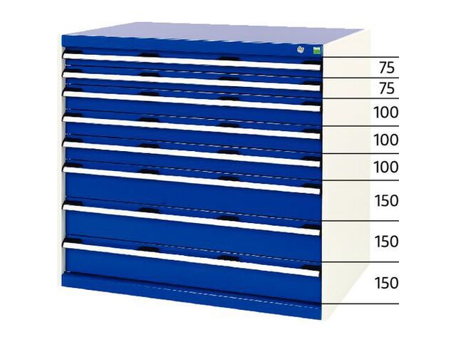 D'une largeur de 1050 mm, d'une profondeur de 750 mm et d'une hauteur de 1000 mm, cette armoire Bott dispose de 8 tiroirs astucieusement agencés pour répondre à tous vos besoins de rangement. Vous trouverez 2 tiroirs de 75 mm de hauteur, parfaits pour les petites pièces et les accessoires, 3 tiroirs de 100 mm pour un rangement moyen, et 3 tiroirs plus spacieux de 150 mm, idéaux pour les outils plus volumineux. Chaque tiroir est conçu pour un accès facile et une visibilité optimale de son contenu, vous faisant gagner un temps précieux lors de vos opérations.
