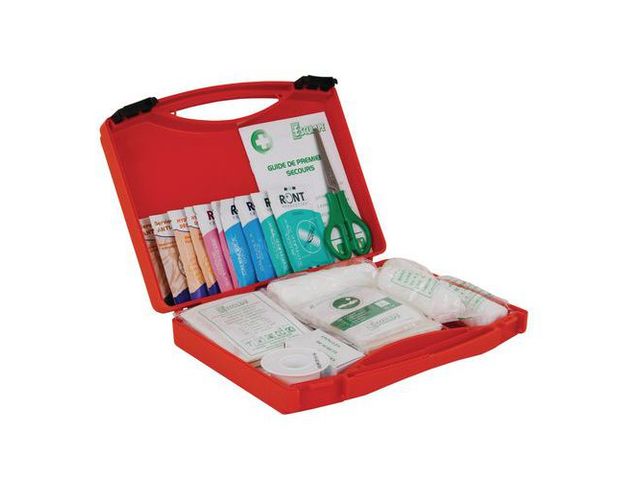 Bouteille de lotion oculaire (solution saline) : 2 x 500 ml Bouteille de lotion oculaire (ph neutre) : 1 x 200 ml Flacons de QuickRince (solution saline) : 5 x 20 ml Distributeur de pansements élastiques : 45 pansements