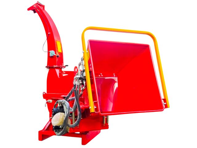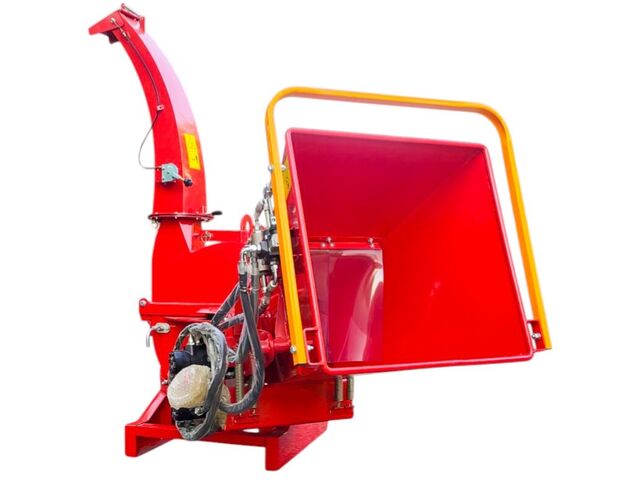 Broyeur de branches avec entraînement par prise de force, équipé d'un système d'alimentation hydraulique.