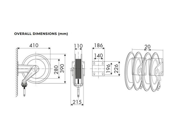 Enrouleur huile 12 m ø 1/2 150 bars Acier Peint avec enroulement automatique et support mural fixe Raasm RA.8390.401
