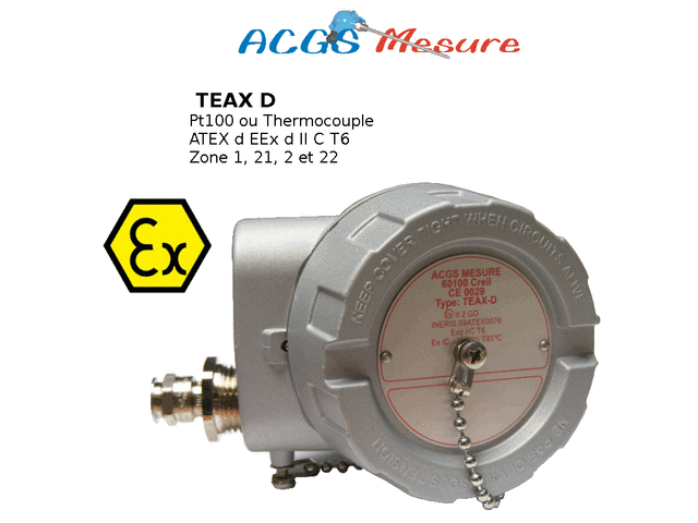 Le Capteur de température à montage lisse sous tête : TEAX D signé par ACGS MESURE, est un équipement industriel de pointe optimisé pour une utilisation en milieu industriel intensif. Certifié ATEX-d Eex d II C T6, il se distingue par sa robustesse, sa fiabilité et sa polyvalence, grâce à sa compatibilité avec de nombreux appareils de mesure thermiques.