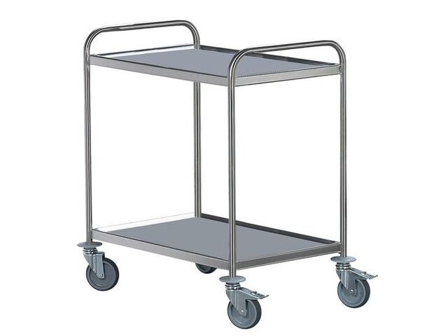 Chariot inox, force: 120 kg, hauteur hors tout: 894 mm, largeur hors tout: 495 mm, longueur hors tout: 695 mm, nb de plateaux: 2, modèle: standard, plateau longueur utile: 570 mm, plateau largeur utile: 370 mm, type de roulette: 4 pivotantes dont 2 à frein, roulette bandage: caoutchouc, roulette ø: 125 mm, châssis matériau: inox, produit recyclé: 90 %, approche éco-responsable: oui, plateau matériau: inox, poids du produit: 15 kg, structure coloris: gris