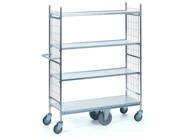 1. Mobilité facilitée : Grâce à ses roues caoutchouc de 100 mm, dont deux pivotantes avec freins, le chariot offre une maniabilité et une stabilité exceptionnelles, même dans des environnements industriels complexes.
