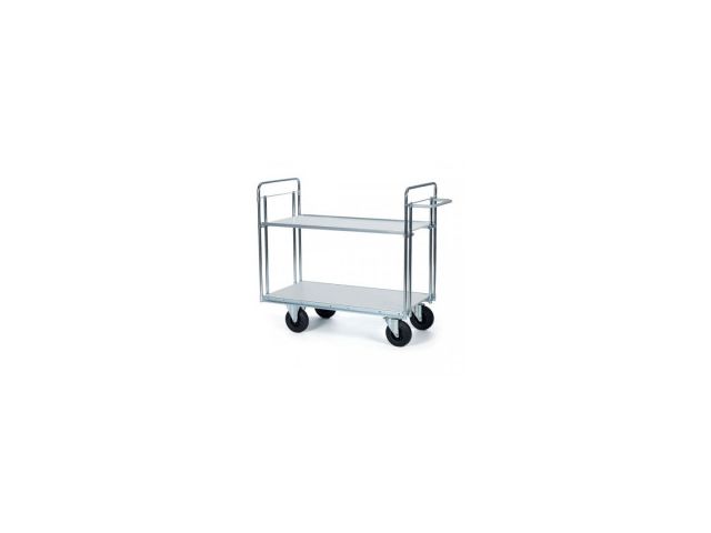 “ Chariot de bureaux à deux plateaux destiné au transport de charges lourdes. Chariot est disponible en 15 dimensions de plateaux différentes. 2 roues pivotantes et 2 roues fixes en caoutchouc de Ø 200 mm . Poignée de poussée ajustable en hauteur. [...] ”