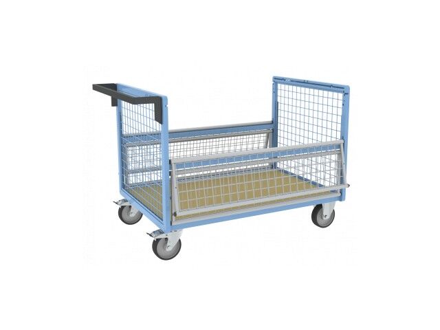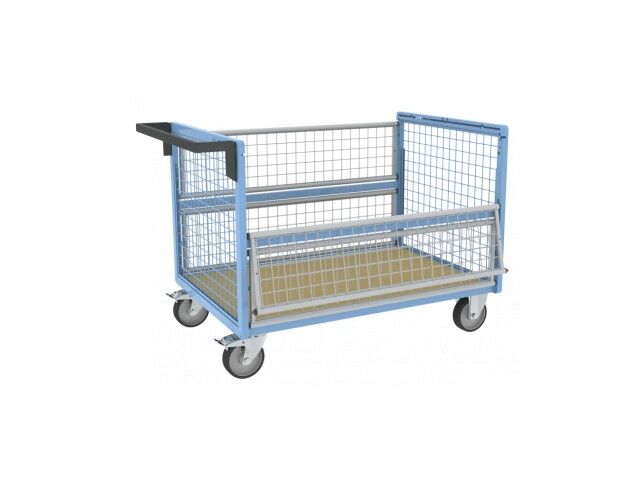 Chariot conteneur en forme de caisse grillagée à grand plateau, conçu pour la collecte, la manutention et le stockage de marchandises jusqu'à 500 kg. Les + du produit :L'ouverture quasi-totale facilite le chargement et le déchargement.Châssis construction robuste entièrement mécano soudée.Demi-panneau avant rabattable.Fabriqué en France.Habillage grillagé maille 50 x 50 mm.Garantie 10 ans.Chariot livré prêt à l'emploi. Dimensions plateau : 1200 x 800 mm Capacité : 500 kg