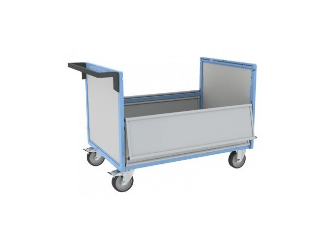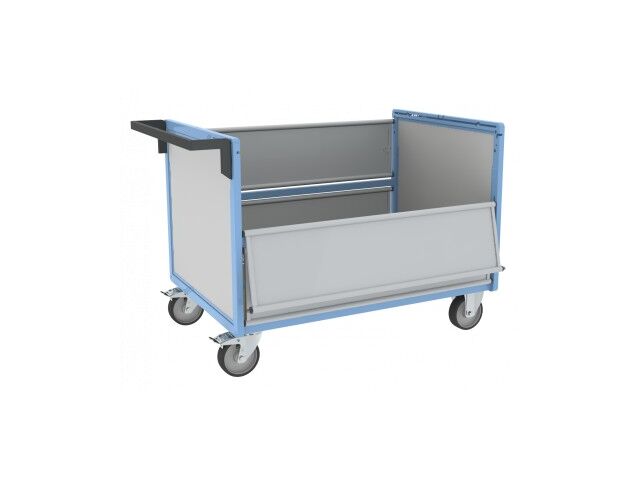 Chariot conteneur en forme de caisse en tôle d'acier avec grand plateau, conçu pour la collecte, la manutention et le stockage de marchandises jusqu'à 500 kg. Les + du produit : Châssis construction robuste entièrement mécano soudée.Ouverture des 2 côtés et quasi totale pour un chargement et déchargement facilité. Fabrication française.Roues 2 fixes + 2 pivotantes à frein à bandage TPE sur roulement à billes, non tachantes, silencieuses. Effort au démarrage réduit de 50 %. Conformes à la norme EN 1757.Garantie 10 ans.Chariot livré prêt à l'emploi. Dimensions plateau : 1200 x 800 mm Capacité : 500 kg