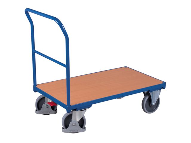 “ Chariot plate-forme à dossier tubulaire. Solide : construction en tube acier mécano soudé. Plateau en bois mélaminé fintion hêtre. Equipé de 2 roulettes pivotantes avec frein central et 2 roues fixes. Charge max. de 500 kg ”