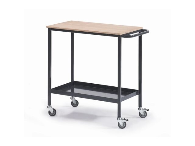 Chariot à plateau supérieur en bois Parfait pour les professionnels recherchant une solution pratique et solide pour le transport de fournitures, dossiers ou petits équipements. Idéal dans les bureaux, ateliers ou espaces de stockage, il facilite la manutention quotidienne.Il est fabriqué en acier carré soudé (25 x 25 x 2 mm). Le plateau inférieur, réalisé en tôle d’acier 15/10ᵉ avec un rebord de 37 mm, sécurise les charges et empêche les objets de glisser. Le plateau supérieur en bois (épaisseur 15 mm) apporte une finition soignée et résistante, adaptée aux environnements intérieurs.Équipé de 4 roulettes pivotantes Ø 75 mm, dont 2 avec frein,. Les bandages en caoutchouc synthétique gris non tachant avec pare-fil intégré protègent les sols et évitent l’encrassement des roues. Finition époxy gris RAL 7024, résistante aux rayures et aux chocs, pour un usage intensif en milieu professionnel.Caractéristiques techniques Structure : acier carré soudé 25 x 25 x 2 mm Plateau inférieur : tôle 15/10ᵉ avec rebord de 37 mm Plateau supérieur : bois épaisseur 15 mm Roulettes : Ø 75 mm (4 pivotantes, 2 à frein) Charge maximale : 150 kg Finition : époxy gris RAL 7024 Options : roulettes à frein sur demandePourquoi choisir ce chariot à plateau bois ? Solide grâce à sa structure en acier soudé Adapté aux environnements professionnels Finition de qualité pour un usage propre et professionnelUtilisation recommandéeCe chariot de manutention convient parfaitement : Aux bureaux administratifs pour transporter du matériel de bureau, dossiers, papeterie Aux ateliers ou zones logistiques pour déplacer des pièces légères Aux collectivités et établissements scolaires pour la manutention quotidienne