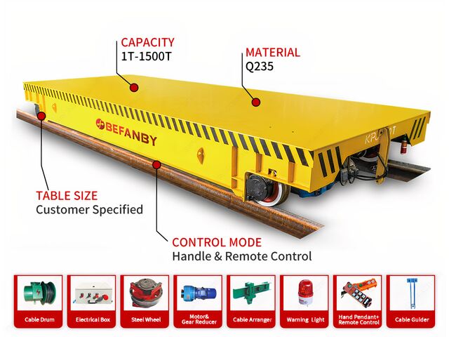Pensé pour le transport de charges extrêmement lourdes dans des milieux industriels exigeants, le chariot de transfert ferroviaire électrique à structure de plate-forme personnalisée BEFANBY répond aux besoins des opérations sous hautes températures et sur de longues distances. Sa structure robuste en acier moulé et son châssis à poutres caissonnées garantissent stabilité et résistance, même lors de sollicitations intensives. Grâce à une alimentation par rail basse tension et des dispositifs de sécurité intégrés, il allie performance, fiabilité et sécurité.