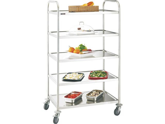 Chariot inox 5 plateauxÉquipement conçu pour répondre aux exigences des professionnels de la restauration, des collectivités et de l’agroalimentaire. Grâce à sa structure en acier inoxydable 201, il est très résistant à la corrosion.Doté de 5 étagères, ce chariot offre une charge utile de 50 kg par plateau, soit une capacité totale de 250 kg. Les plateaux stables et parfaitement espacés (570 mm) permettent de transporter efficacement assiettes, ustensiles ou bacs gastronormes sans risque de chute.Ses 4 roues directionnelles permettent de le déplacer facielement, même dans les espaces étroits. Pour plus de sécurité lors du chargement ou du déchargement, 2 roues sont équipées de freins. Livré en kit, il se monte facilement et rapidement sans outils spécifiques. Son design épuré et professionnel s’intègre parfaitement dans tous les environnements de travail : cuisines, laboratoires, ateliers, ou zones de préparation.Caractéristiques techniques Matériau : acier inoxydable 201 Nombre de plateaux : 5 Charge utile : 50 kg / plateau (250 kg total) Dimensions extérieures : L 845 × P 528 × H 1 550 mm Dimensions des plateaux : L 830 × P 510 mm Dimensions utiles : L 755 × P 440 mm Espacement entre plateaux : 570 mm Roues : 4 directionnelles dont 2 avec frein Livraison : en kit, montage facilePourquoi choisir ce chariot inox 5 plateaux ? Sa conception tout inox Sa grande capacité de charge adaptée aux usages intensifs Solution économique pour les professionnels exigeants