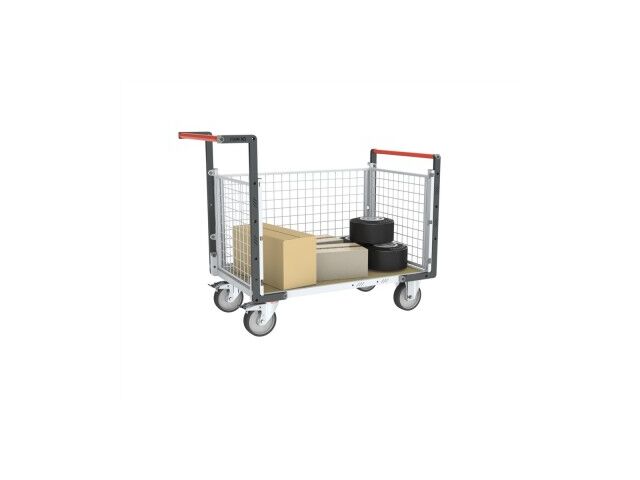 Chariot modulaire à 2 dossiers et 1 ridelle et un grand plateau en bois pour une utilisation intensive, adapté pour faciliter le transport de charges jusqu'à 500 kg. Les + du produit :Fabrication française.Garantie 10 ans.Chariot livré monté prêt à l'emploi.Habillage tube permettant de bien caler les charges.Les ridelles se positionnent dans des glissières et sont équipées de crochets de maintien permettant une bonne tenue avec le dossier.Effort au démarrage réduit de 50%. Conformes à la norme EN 1757. Dimensions plateaux : 1075 x 735 mm Capacité : 500 kg