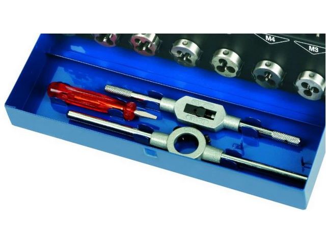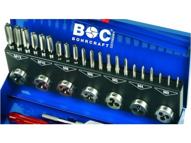 1. Coffret complet : Comprend tout le nécessaire pour réaliser des taraudages précis allant de M3 à M12, grâce notamment aux filières et tarauds selon les normes DIN 223, 225 et 352.