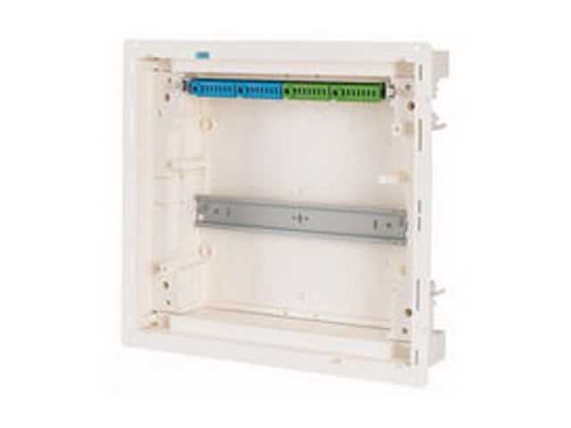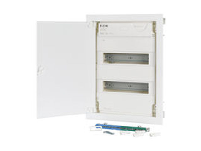 Le coffret Eaton encastré xComfort KLV est une solution idéale pour la gestion de la distribution électrique dans les bâtiments résidentiels et tertiaires. Conçu pour offrir une installation électrique sûre et esthétique, il répond aux besoins variés grâce à sa capacité de 1 à 4 rangées de 12+2 modules. Avec un niveau à bulle intégré, il met l'accent sur une installation rapide et précise.