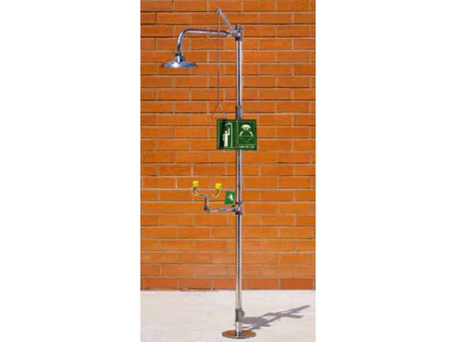 EXACTA SAFETY STORAGE CABINETS met à votre disposition des combinés lave-yeux et douche double commande sur pieds AF4260TI, idéals pour la décontamination du corps et du visage et prévus pour une installation en intérieur ou en extérieur.