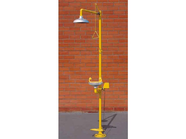 A triple commande avec pédale, ces combinés sur pieds se composent de lave-yeux par palette de commande ou pédale et de douche par tige.