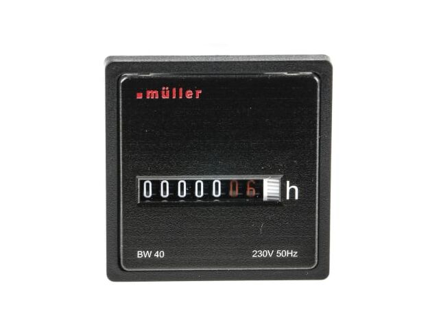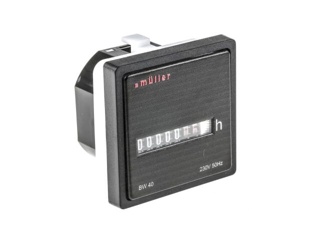 Le compteur horaire BW40 de Muller est un dispositif de mesure conçu pour enregistrer avec précision le temps de fonctionnement des équipements industriels. Son affichage analogique à 5 digits permet un suivi clair et continu des heures d’utilisation, essentiel pour la maintenance préventive et la gestion des cycles machines.
