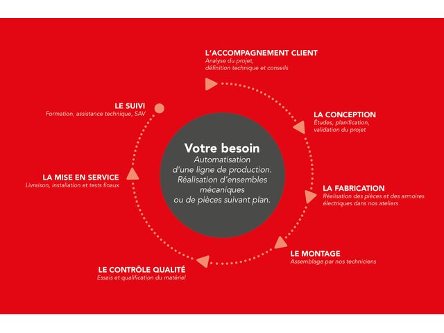 La conception et l’assemblage sont majoritairement réalisés en interne, depuis l’étude technique jusqu’au montage final. Cette organisation assure un haut niveau de fiabilité, une parfaite conformité au cahier des charges et une intégration optimale des machines dans l’environnement industriel existant.