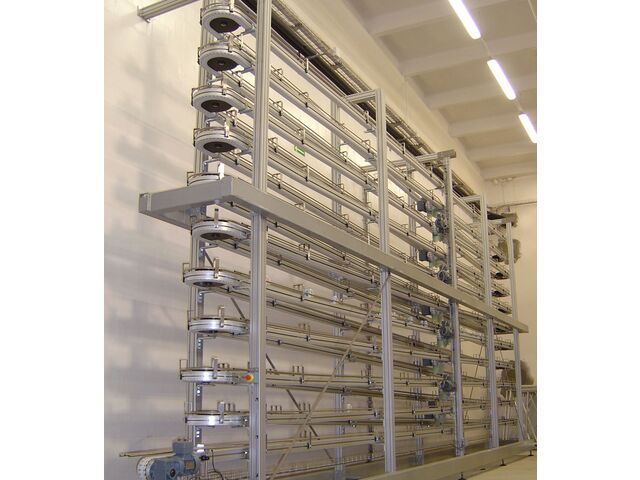 Conçu pour l’accumulation, la création de zones tampons et le refroidissement des produits entre différentes étapes de production, il se caractérise par une inclinaison verticale efficace avec un encombrement minimal.