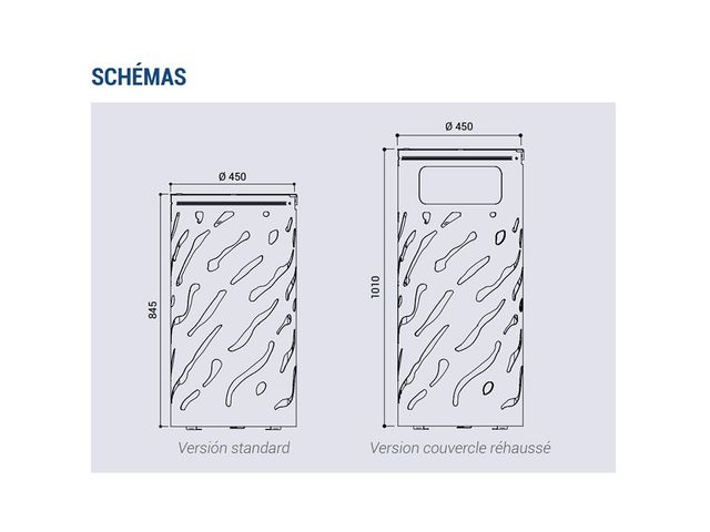 “ Livraison sous 4 semaines Corbeille Venise couvercle réhaussé 80 litres en acier galva et peint Couvercle équipé d’une serrure à clé triangle. Contenance : reçoit des sacs de 80 litres (non fournis) Ø 450 x H 1010 mm - 10 coloris au choix ”