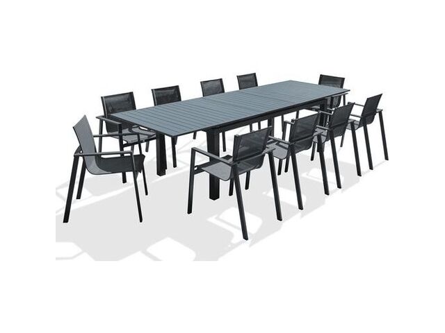 Profitez de repas en plein air inoubliables avec le salon de jardin Miami de DcbGarden, un ensemble complet conçu pour accueillir jusqu'à 10 personnes avec style et confort. Cet ensemble exceptionnel comprend une table de jardin spacieuse de 300x100 cm, parfaite pour réunir famille et amis, accompagnée de 10 fauteuils élégants en aluminium de couleur anthracite. La table Miami, avec son plateau généreux de 3000 mm de longueur et 1000 mm de largeur, offre un espace généreux pour tous vos convives, que ce soit pour un déjeuner décontracté, un dîner festif ou simplement un moment de convivialité autour d'un verre. Sa conception moderne et épurée s'intègre harmonieusement dans tous les extérieurs, apportant une touche d'élégance à votre jardin, terrasse ou balcon.