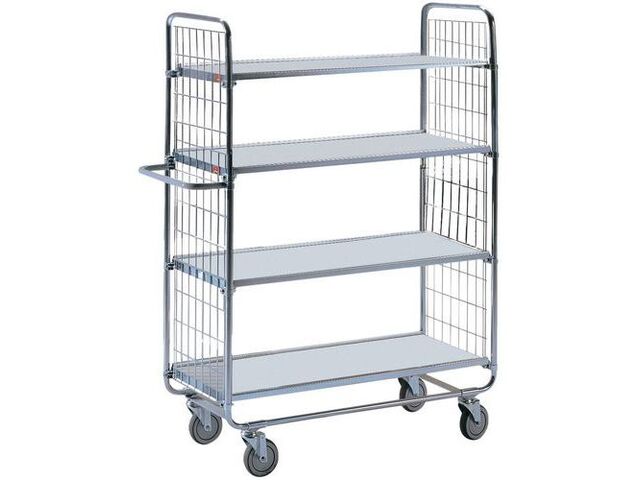 Desserte à plateaux bois plastifié, force: 200 kg, hauteur hors tout: 1585 mm, largeur hors tout: 460 mm, longueur hors tout: 1180 mm, nb de plateaux: 4, structure coloris: gris, plateau longueur utile: 1000 mm, plateau largeur utile: 425 mm, roulette bandage: caoutchouc, roulette ø: 125 mm, type de roulette: pivotante, châssis matériau: acier galvanisé, plateau matériau: bois + revêtement plastique, poids du produit: 44.0 kg
