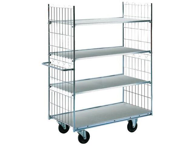 Desserte à plateaux bois plastifié, force: 300 kg, hauteur hors tout: 1690 mm, largeur hors tout: 650 mm, longueur hors tout: 1390 mm, nb de plateaux: 4, structure coloris: gris, plateau longueur utile: 1200 mm, plateau largeur utile: 600 mm, roulette bandage: caoutchouc, roulette ø: 160 mm, type de roulette: 2 fixes + 2 pivotantes, châssis matériau: acier galvanisé, plateau matériau: bois + revêtement plastique, poids: 69 kg, charge maxi par plateau: 100 kg