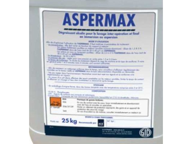 ASPERMAX est un produit liquide en phase aqueuse destiné à être utilisé en substitution des solvants dans des fontaines de dégraissage pour pièces mécaniques ou plastiques. Sa formulation permet le dégraissage rapide et performant des inox, fonte, aluminium et alliages d'aluminium, métaux cuivreux et alliages non sensibles, etc... Non moussant à température d'utilisation, il est particulièrement recommandé pour les traitements par aspersion (basse pression) à haute température. Grâce à sa formulation alcaline et sans COV, ASPERMAX est apprécié pour son pouvoir dégraissant sans comparaison, son pouvoir de relargage des huiles étrangères et sa protection temporaire anticorrosion haut de gamme.