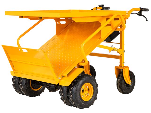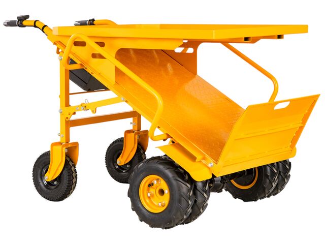 Diable électrique d'une capacité de 400 kg, d'une largeur de 940 mm conçu pour le transport de charges lourdes sur des surfaces irrégulières telles que l'herbe, le gravier, la plage, les allées de jardin, les chemins de terre, etc.