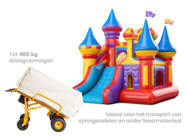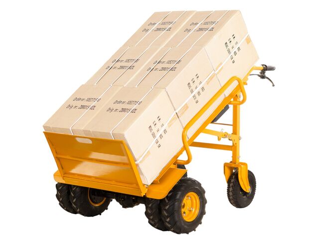 Diable électrique d'une capacité de 400 kg, d'une largeur de 940 mm conçu pour le transport de charges lourdes sur des surfaces inégales telles que l'herbe, le gravier, la plage, les allées de jardin, les chemins de terre, etc.