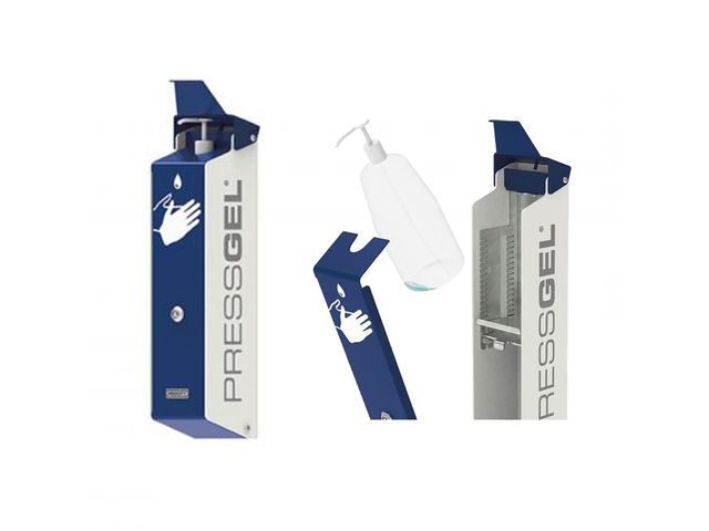 Type : Distributeur à poussoir de gel hydroalcooliqueFixation : Murale ou sur platineCommande : Mécanique au coudeMatériau : Acier peint bicolore (Blanc RAL 9010 et Bleu RAL 5017)Dimensions du modèle mural : Long 120 x Larg 130 x Haut 650 mmDimensions du modèle sur platine : Long 120 x Larg 130 x Haut 1148 mmCapacité : Pour flacons de hauteur 80mm à 300mm et diamètre 110mm maximumSécurité : Porte frontale verrouillable par clé de 8mm