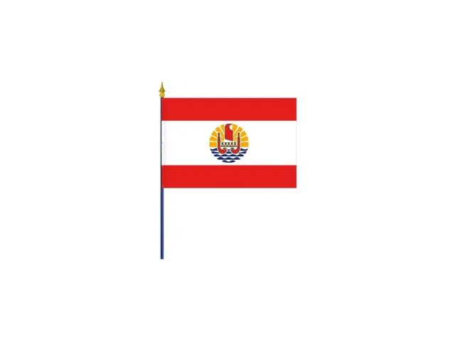 Drapeau DOM-TOM Polynésie française sur hampe, disponible en plusieurs tailles pour une utilisation en intérieur ou extérieur. Possibilité de fabrication sur mesure : format, finition et impression personnalisée. Nos drapeaux de pavoisement peuvent être fixés sur nos supports muraux en accessoires. Pour pavoiser les façades de bâtiments : pose sur supports muraux obliques ou écussons porte-drapeaux Orner les salles intérieures : bureaux, salles de réunion, halls d#039;accueil, conférence, etc ... (sur socles/pieds au sol) Informations détaillées Tissu maille polyester M1 3 fils bloqués 115 gr/m2 (autres tissus sur devis ) Tissu fini avec un ourlet double aiguille sur les 4 côtés Livré monté, prêt à installer, sur une hampe en bois (pin des Landes) gainée de plastique bleu et terminée par une lance plastique dorée en relief aspect bronze Tissu fixé par des clous de tapissier laitonnés Options supplémentaires sur devis Tissu maille polyester "grand vent" microperforée 115 g/m² Tissu maille polyester recyclée 3 fils bloqués 115 g/m² Système anti-enroulement Coins renforcés Plombage Sur-mesure selon vos besoins : hampe brute, agrafage, coupe franche, etc.