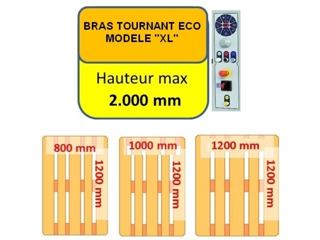 Le BRAS TOURNANT ECONOMIQUE peut traiter des palettes allant jusqu'à 1000 x 1200 mm ou 1200 x 1200 mm pour la version XL et jusqu'à une hauteur de 2000 mm. La machine fonctionne à une tension d'alimentation de 230 V monophasé + terre / 50 Hz, possède une puissance installée de 0,7 kW et pèse 205 kg.