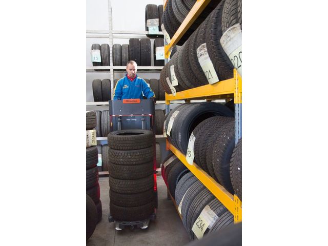 Charge maximale : 220 kg (1 personne)Hauteur maximale de travail : 5,15 mRayon de braquage : 0Largeur : 0,70 mLongueur : 2,25 mCapacité de charge de l'outil de stockage des pneus : 120 kgTempératures de fonctionnement : -15°C à +40°CSystème de prise au sol : Permet de prélever directement les pneus du sol
