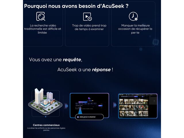 Technologies IA Intégrées (AcuSeek) : Bénéficiez de fonctionnalités avancées comme la reconnaissance faciale, la protection périmétrique virtuelle et le comptage de personnes. Ces outils permettent de rechercher des événements spécifiques de manière ultra-rapide et d'envoyer des alertes ciblées.