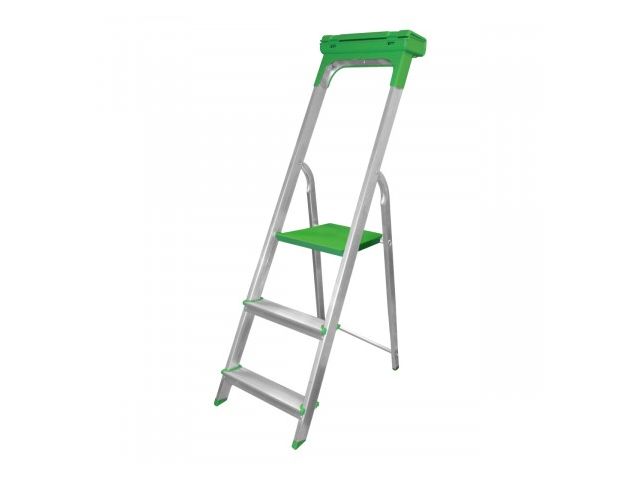 “ Escabeau en aluminium économique avec porte-outils fermable. Doté d'un garde-corps et de marches antidérapantes pour une sécurité maximale. Plate-forme en plastique rainuré & Escabeau supportant jusqu'à 150 kg. [...] ”