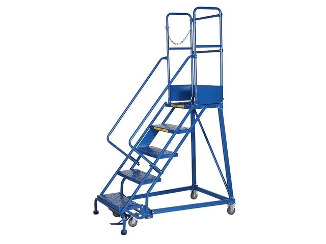 Escabeau roulant sécurisé de 4 à 7 marches (plateforme incluse)Les dimensions de la plateforme sont de 0,62 m x 0,42 m (L x P), offrant ainsi un confort optimal et une sécurité maximale lors du travail.La plateforme est entourée d'une plinthe de 15 cm de hauteur et équipée d'une chaîne antichute pour sécuriser son utilisation.Système de sécurité et de stabilisation La sécurité est assurée par un système d'immobilisation automatique : dès que l'opérateur lâche le levier pour monter sur l'escabeau, un mécanisme à ressorts abaisse les deux patins, immobilisant ainsi totalement l'escabeau.Pour le déplacer, l'opérateur actionne un levier qui libère les patins en caoutchouc.Deux stabilisateurs situés à l'arrière garantissent un arrêt automatique lorsque l'utilisateur monte sur l'escabeau et assurent sa stabilité lorsqu'il est immobilisé. Ces stabilisateurs sont verrouillables en position de roulage et d'utilisation.Caractéristiques techniques Roulettes non tachantes : 2 pivotantes et 2 fixes, de 100 mm de diamètre et 30 mm d'épaisseur. Charge maximale : 160 kg. Structure en acier avec finition époxy. Coloris : bleu RAL 5005.Utilisations : Équipement idéal pour la mise en rayon. Picking sécurisé et gain de temps pour la logistique en hauteurPourquoi choisir notre escabeau roulant à immobilisation automatique ? Choisir notre escabeau roulant, c'est investir dans un équipement robuste, fabriqué en tenant compte des normes de sécurité en vigueur. Si vous recherchez une solution de travail en hauteur sûre, pratique et durable, cet escabeau est ce qu'il vous faut. C'est choisir un matériel sécurisé.Escabeau livré démonté pour les références 5, 7 et 8 marches, à monter par vos soins.Explorez également notre gamme complète d'escabeaux roulants pour trouver le produit qui répondra le mieux à vos attentes spécifiques.