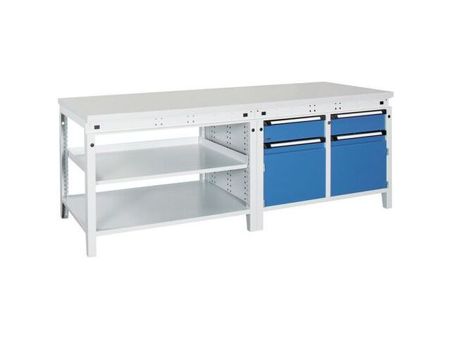 Établi function 230 avec tablettes, caissons et tiroirs, charge maxi: 1500 kg, hauteur hors tout: 850 mm, largeur hors tout: 2300 mm, plateau d'établi matériau: stratifié, profondeur hors tout: 750 mm, plateau épaisseur: 40 mm, nb de tiroirs: 2, nb de tablettes: 2, tiroir hauteur: 150 mm, nb de portes: 0, nb de caissons: 2, tiroir charge maxi: 80 kg, emballage recyclable: oui - 100 %, produit recyclable: oui - 100 %, poids du produit: 136 kg, caisson hauteur hors tout: 420 mm