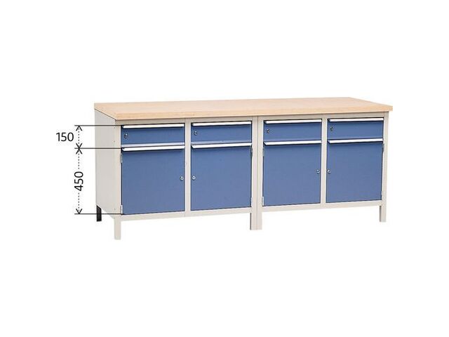 Établi complet modul 200 avec armoires et tiroirs, charge maxi: 500 kg, hauteur hors tout: 810 mm, largeur hors tout: 2000 mm, plateau d'établi matériau: hêtre multiplis, profondeur hors tout: 750 mm, plateau épaisseur: 40 mm, nb de tiroirs: 4, nb de tablettes: 0, tiroir hauteur: 150 mm, nb de portes: 4, nb de caissons: 0, tiroir charge maxi: 60 kg, emballage recyclable: oui - 100 %, produit recyclable: oui - 100 %, poids: 121 kg