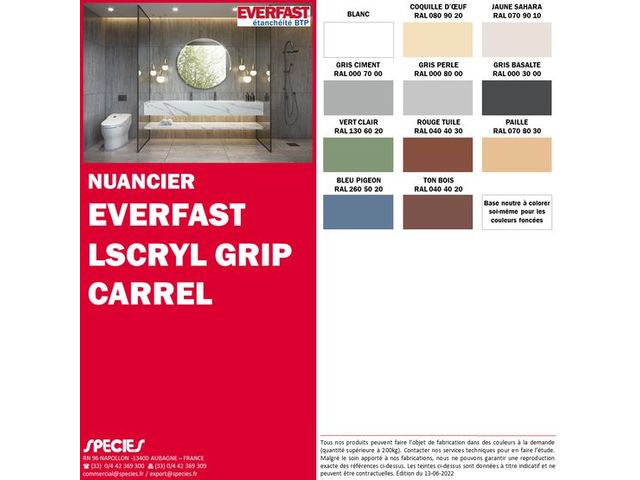 Le EVERFAST SCRYL GRIP CARREL décliné en plusieurs teintes (gris perle, gris basalte, blanc, coquille d’œuf, rouge tuile, jaune sahara, paille, vert clair, bleu pigeon, ton bois et base neutre à colorer pour les couleurs sombres), offre un séchage rapide en 2 heures.